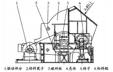 在單段錘式破碎機(jī)運(yùn)行過程中,大塊石頭物料進(jìn)入破碎腔內(nèi),堆放在機(jī)器內(nèi)特設(shè)的中間托架上,由在托架間隙中運(yùn)行的破碎機(jī)錘頭擊碎而墜落,再經(jīng)高速運(yùn)轉(zhuǎn)的錘頭進(jìn)一步打擊而細(xì)碎,符合尺寸規(guī)格的石料, 后經(jīng)篦板均整合格后排出。