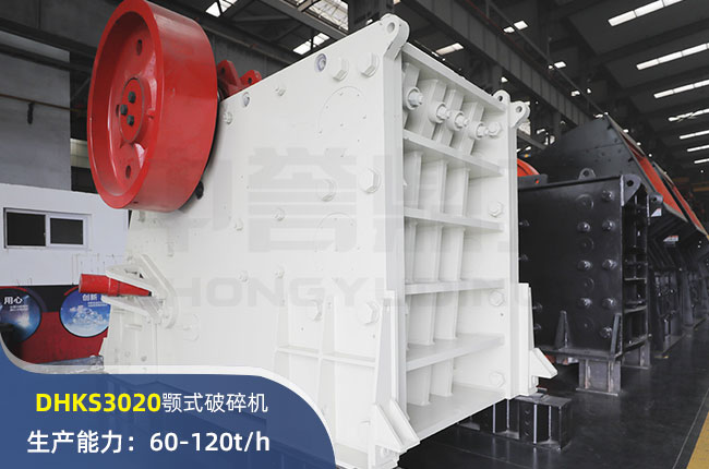 DHKS3020顎式破碎機(jī)進(jìn)料粒度在425mm,出料大小50-120mm,時(shí)產(chǎn)量在60-120噸左右,電機(jī)是55kw的,屬于中小型顎式破碎機(jī)。