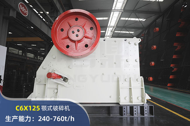 C6X125顎式破碎機進料口尺寸950×1250mm,進料粒度≤950mm,出料大小≤100mm,時產在240-760噸左右。