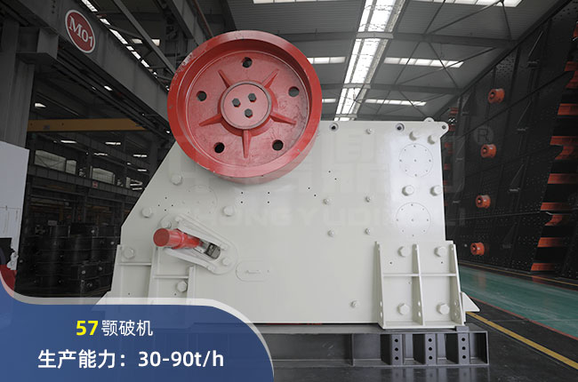 57顎式破碎機偏心軸轉速為250r/min,搭配55kw電機,電動機型號為Y315-8,轉速是720r/min,該設備不含電機重10.5噸。