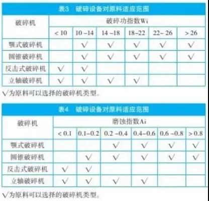 Wi:破碎功指數——物料破碎的難易程度,Ai:磨蝕指數——物料對機件的磨損程度,常見礦石的Wi和Ai見表1、表2。破碎設備對原料的適應范圍見表3、表4。