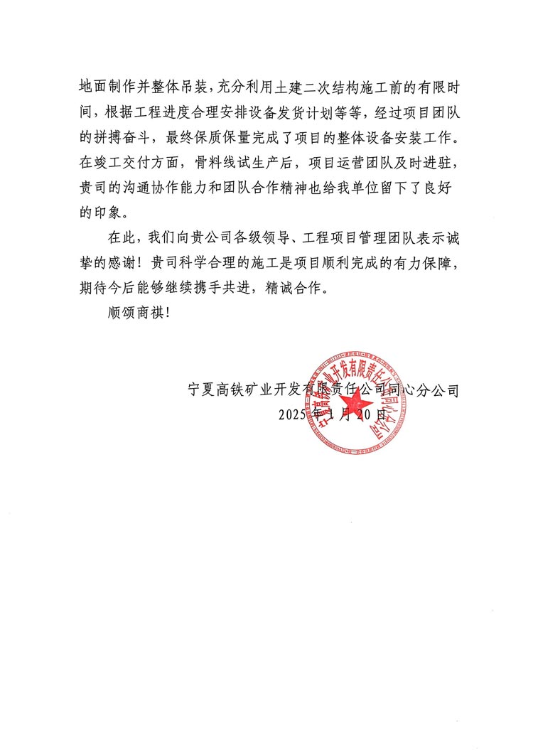 新春前夕,中譽鼎力迎來了一份的新年禮物——寧夏高鐵同心分公司的感謝信和錦旗。感恩客戶對我們過去一年工作的高度認可,新的一年,愿與所有客戶及企業同仁攜手共進,披荊斬棘,續寫高質量發展華彩新篇。