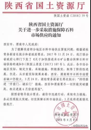 近日,陜西省土資源廳發布《陜西省土資源廳進一步采取措施保障石料市場供應的通知》,提到:目前,西安、渭南兩市石料市場需求缺口較大。《通知》要求:西安和渭南要盡所能僵局,迅速行動,采取有力措施,務實現較大,切實保障石料市場供應,5月底將進展情況報陜西省土資源廳。