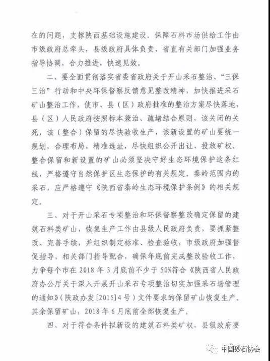 2、要面貫徹落實省委省關于開山采石整治、“三保三治”行動和環保督察反饋意見整改精,加快推進采石礦山整治工作,使市、縣(區)批準的整治方案盡快落地,縣(區)人民按照標本兼治、疏堵結合原則,該關閉的關死,該(整合)保留的盡快驗收生產,該新設置的礦山要統一規劃,合理布局,選址,盡快組織公開出讓、投放礦權。整合保留和新設置的礦山須堅決守好生態環境保護這條紅線,嚴格遵守自然保護區生態保護的有關規定,秦嶺范圍內的采石,應嚴格遵守《陜西省秦嶺生態環境保護條例》的相關規定。
