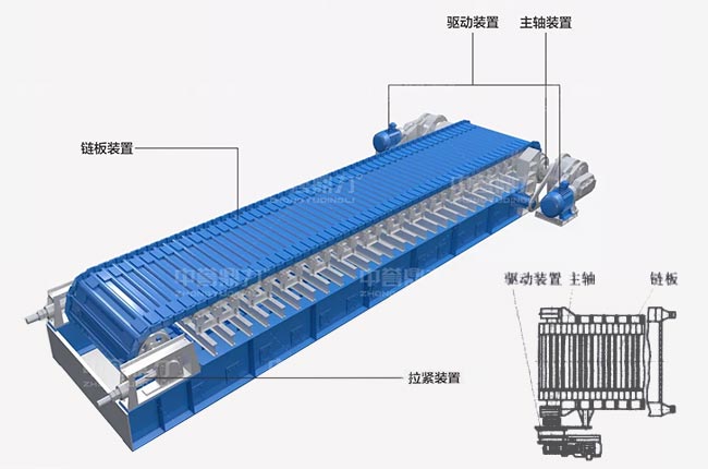 板式給料機的組成部分包括機架、主軸裝置、驅(qū)動裝置(電動機、聯(lián)軸器、減速器)、鏈板裝置、拉緊裝置、支重輪、托鏈輪等。