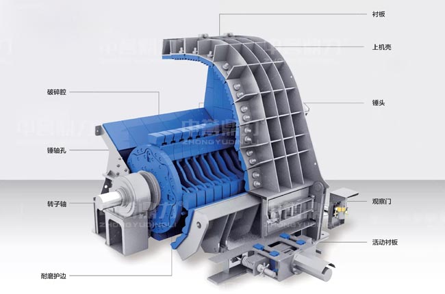 大型錘式破碎機(jī)由機(jī)殼、轉(zhuǎn)子、反擊板、錘頭、支架、襯板等組成。