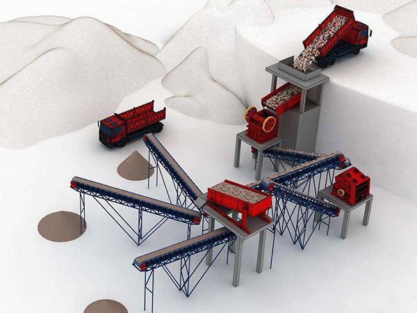大塊礦石經(jīng)料堆由振動喂料機均勻送入顎破進行初級粉碎,初級粉碎后的礦石再由傳送設(shè)備運輸給圓錐碎石機進行中整型破碎,然后經(jīng)礦山振動篩篩選分級,大于40毫米的礦石重新返回圓錐碎石機,40毫米以下的礦石由傳送設(shè)備送入打砂機進行整形,整形后的成品經(jīng)由礦山振動篩篩選分級,由傳送設(shè)備運輸至成品區(qū)。