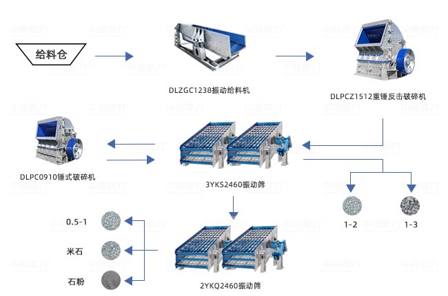 一次成型方案重錘式破碎機具備“鄂式破碎機和反擊式破碎機”的破碎特點,可直接生產出石子骨料,搭配整形破碎機是用于回料的破碎,相同與反擊破對回料的加工,兩種方案相比重錘破投資較小,如采用產量較大些的PCZ1615重錘式破碎機可以不用整形破碎機,生產線僅需一臺破碎機即可完成石子的生產,投資成本更小。